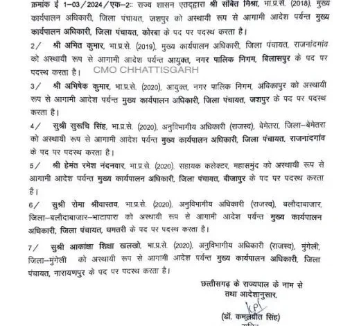 रायपुर। राज्य शासन द्वारा भारतीय प्रशासनिक सेवा के अधिकारियों के नवीन पदस्थापना आदेश जारी किए गए है। जारी सूची में 7 आईएएस अफसरों के नाम शामिल है। जिसमें अमित कुमार, अभिषेक कुमार, सुरुचि सिंह, हेमंत रमेश नंदनवार , रोमा श्रीवास्तव और आकांक्षा शिक्षा खलखो शामिल है।