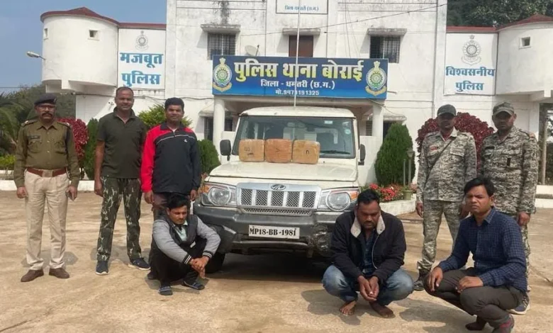 जिस पर अति.पुलिस अधीक्षक मधुलिका सिंह के मार्गदर्शन में एसडीओपी. नगरी मयंक रणसिंह एवं उप पुलिस अधीक्षक नक्सल आर० के० मिश्रा के नेतृत्व में थाना प्रभारी बोराई निरी.प्रमोद अमलतास के नेतृत्व में बोराई स्टॉफ के साथ वाहन चेकिंग थाना बोराई बेरियर नाका में उड़ीसा की ओर से आती हुई एक सफेद रंग की बोलेरो कार कमांक MP-18, BB-1981 को संदेह के आधार पर चेक किया जिसमें तीन व्यक्ति बैठे मिले उक्त वाहन को चेक करने पर एक काला बैग के मादक पदार्थ गांजा मिला। जिसकी कीमत 2,84,000 है।