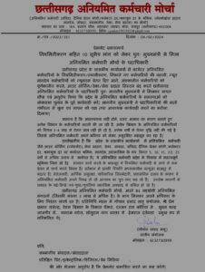 छत्तीसगढ़ अनियमित कर्मचारी मोर्चा, अपने 86 सहयोगी अनियमित संगठनों (जिसकी संख्या 3 लाख से अधिक है) के साथ मिलकर अपने अधिकार के लिए निरंतर संघर्ष रत है| प्रतिनिधि मंडल में गोपाल प्रसाद साहू संयोजक, श्री प्रेम प्रकाश गजेन्द्र, रेशम विभाग के विकास पैकरा, रज्जन राम कोरिया से , भुवन चन्द्र जांजगीर से, बलराम बघेल, सोनुराम नाग बस्तर से हेमराज दंतेवाडा प्रमुख रूप से सम्मिलित थे|