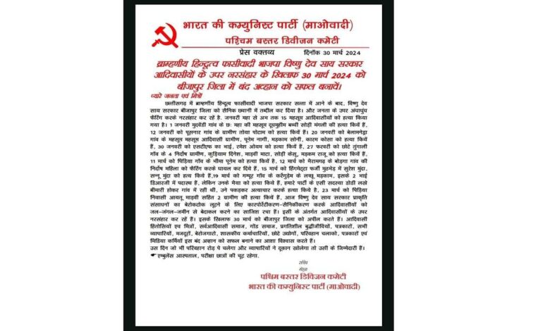 7. होली के दूसरे दिन नक्सलियों ने जारी किया प्रेस नोट, 30 मार्च को बीजापुर बंद, BJP सरकार पर लगाए गंभीर आरोप