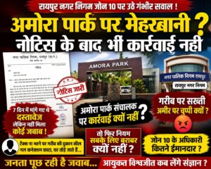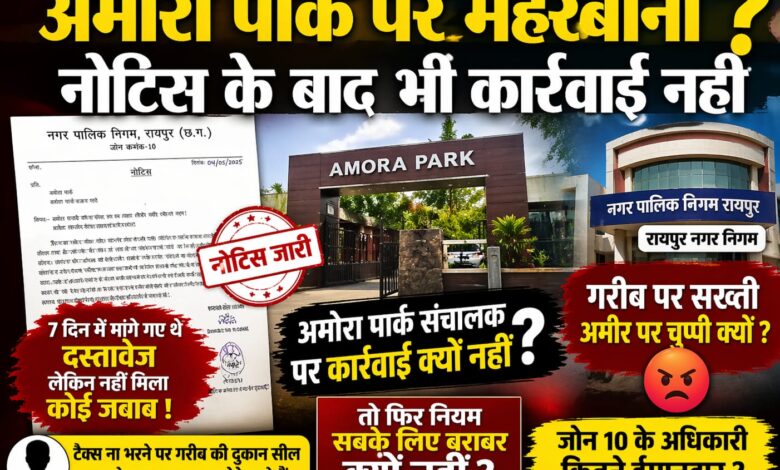 रायपुर। नगर निगम जोन क्रमांक 10 एक बार फिर अपने कामकाज को लेकर विवादों में घिर गया है। “अमोरा पार्क” के संचालक को नोटिस जारी करने के बाद भी अब तक कोई ठोस कार्रवाई न होना निगम के दोहरे रवैये को उजागर करता नजर आ रहा है।