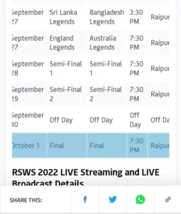 देहरादून के राजीव गांधी इंटरनेशनल क्रिकेट स्टेडियम में 21 सितंबर से 25 सितंबर के बीच 6 मैच खेले जाएंगे। इसके बाद 26 सितंबर ऑफ डे होगा और टीमें रायपुर आएंगी। रायपुर में 27 सितंबर को दो मैच होंगे। पहला मैच श्रीलंका और बांग्लादेश लीजेंड्स के बीच होगा। यहां मैच दोपहर 3.30 से खेला जाएगा। इसके बाद शाम को 7.30 बजे से इंग्लैंड और ऑस्ट्रेलिया लीजेंड्स के बीच मैच होगा।