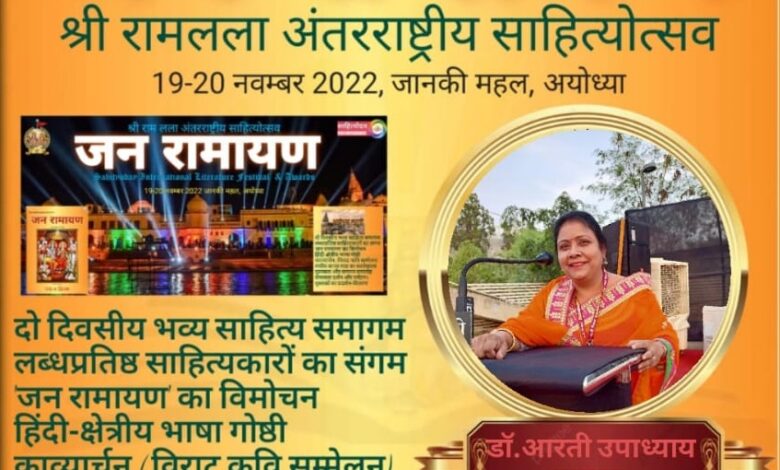 अयोध्या में जन रामायण महोत्सव साहित्यकारों का होगा जमावड़ा,समाजसेवी डॉ आरती उपाध्याय होंगी शामिल