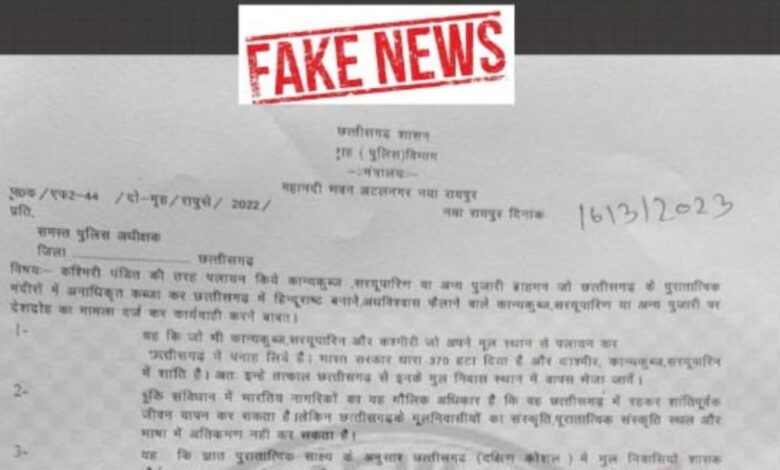 दरअसल, सोशल मीडिया में गृह विभाग के अवर सचिव मनोज श्रीवास्तव के नाम से एक पत्र वायरल होने लगा, जिसमें कश्मीरी पंडितों की तरह पलायन करने वाले कान्यकुब्ज, सरयूपारीण और पुजारी ब्राह्मणों ने छत्तीसगढ़ के पुरातात्विक मंदिरों पर अनाधिकृत रूप से कब्जा कर लिया. छत्तीसगढ़ में हिंदू राष्ट्र बनाने के लिए अंधविश्वास फैलाने के आरोप में देशद्रोह के तहत मामला दर्ज करने का जिक्र था.
