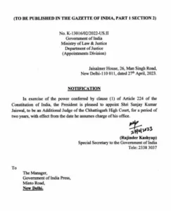 रायपुर। छत्तीसगढ़ हाई कोर्ट में अतिरिक्त जज के तौर पर संजय कुमार जायसवाल की नियुक्ति की गई है। गौरतलब है कि यह नियुक्ति पदभार ग्रहण करने से लेकर दो साल के लिए की गई है।